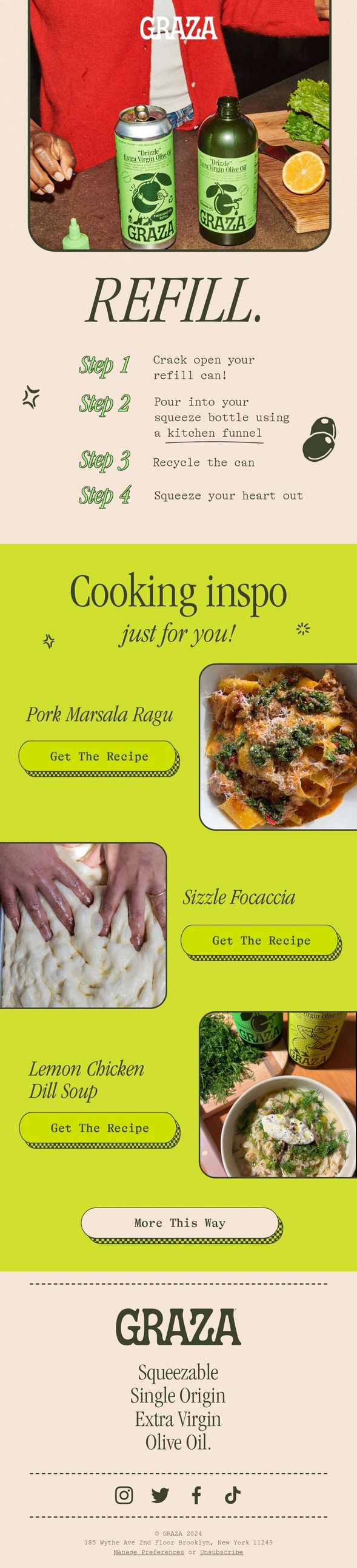 This Graza olive oil email helps solve two common customer headaches: how to refill those squeeze bottles and what to whip up with their product. The design cleverly combines practical guidance with culinary inspiration, all wrapped in their playful, approachable brand identity.